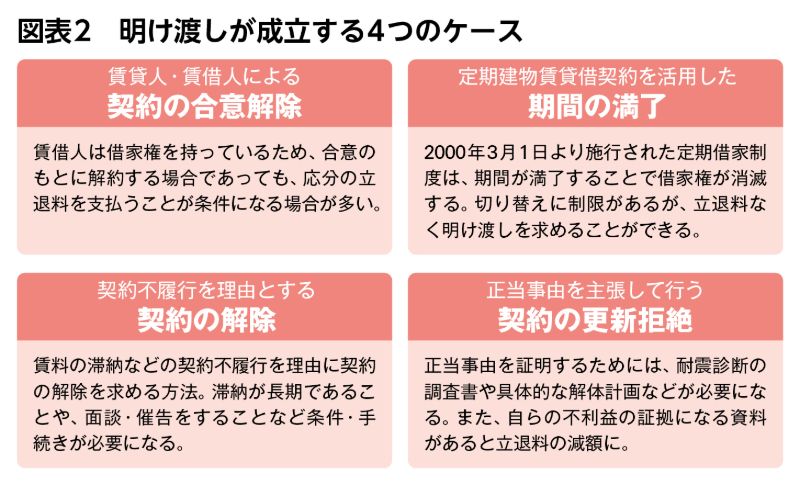 明け渡しが成立するケースは、①賃貸人・賃借人の合意に基づく賃貸借契約の解除、②定期建物賃貸借契約による期間の満了、③契約不履行を理由とした契約の解除、④老朽化などを正当事由とする賃貸借契約更新の拒絶などが考えられます