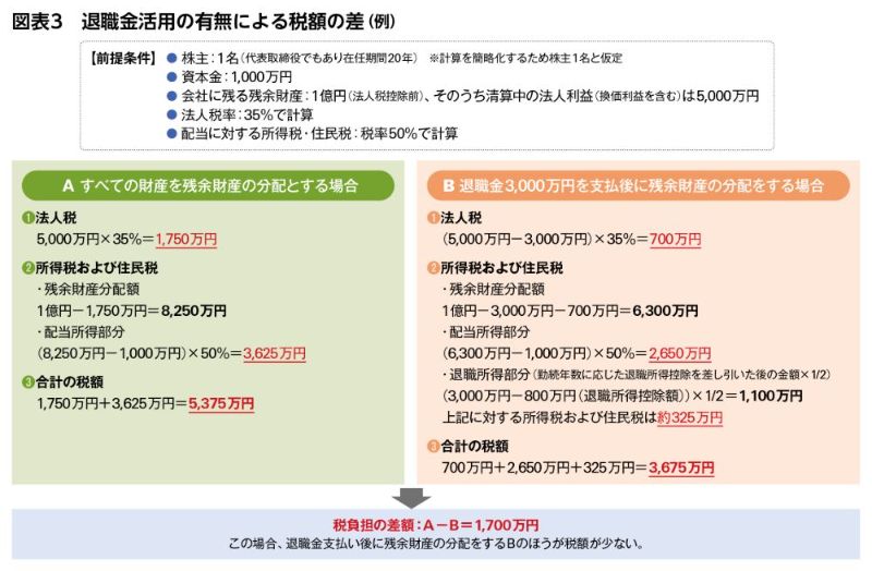 また、残余財産の分配額も退職金の分だけ減りますので、最終的に配当金としての課税対象も減少します。つまり、残余財産の分配対象の一部または全部を退職金へ振り替えるということです。